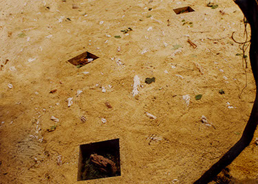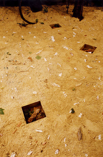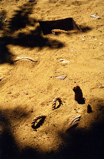 Ces moulages de cordes n'ont jamais été cuits et ne jouent pas le même rôle que celui de l'installation "Chordes". Plantés dans le sable, cachés comme des racines, ils émergent au gré des irrégularités de la surface du sol. Seules trois boites transparentes, telles des coupes de terrain offertes au regard, permettent au spectateur d'assister durant un mois à la lente dissolution des pièces le temps de l'exposition.