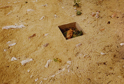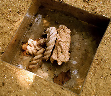 These rope casts have never been fired and have a different function than in the "Chordes" installation. Pitched in the sand, hidden like tree roots, they emerge following the irregularities of the earth’s surface. Only three transparent boxes, like cross-sections of the ground, are exposed to the public gaze and allow the onlooker to witness the slow disintegration of the pieces in the period of a month during the exhibition. The underlying idea of archaeological remnants was omnipresent.